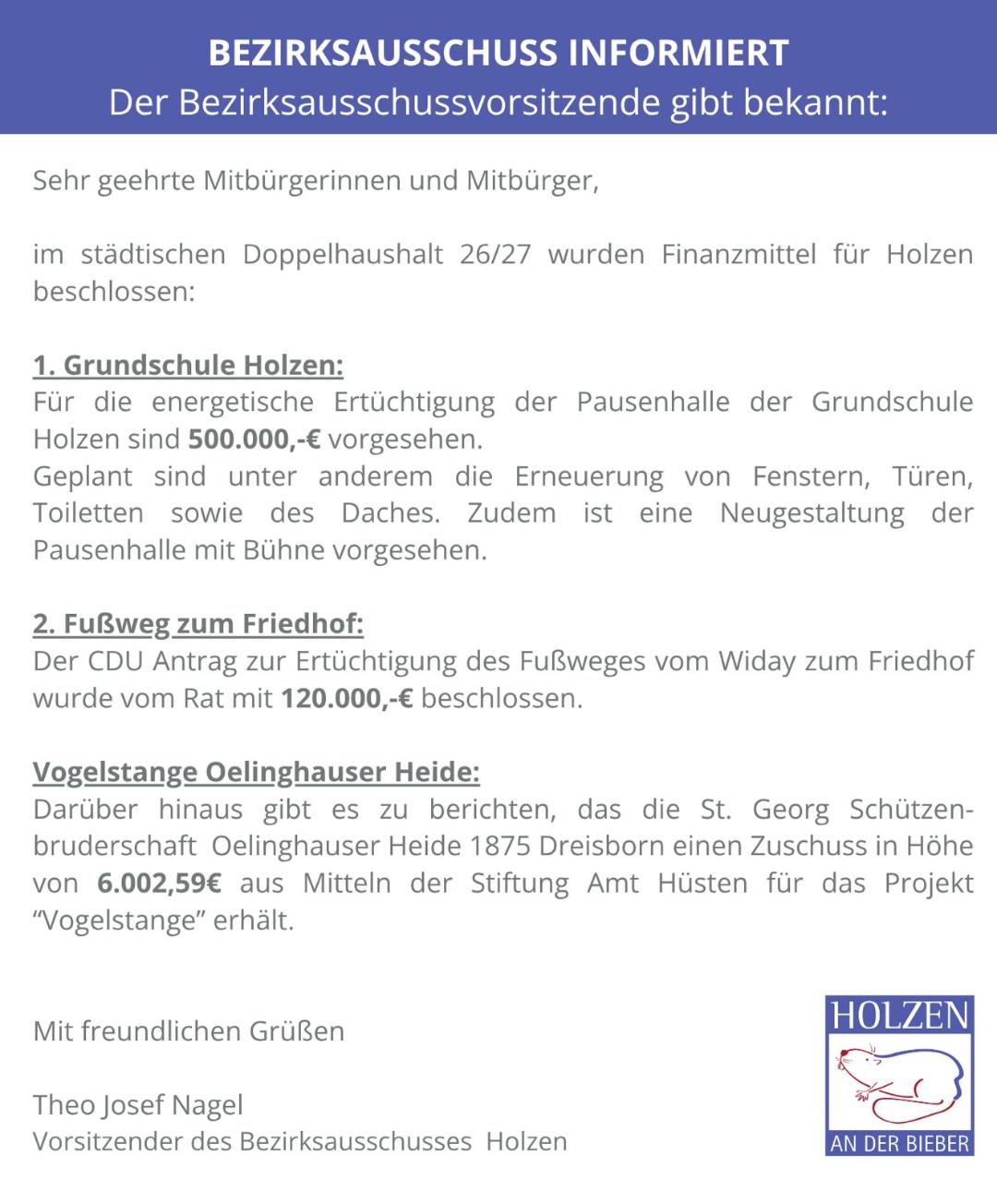 Der Bezirksausschuss Holzen gibt bekannt: